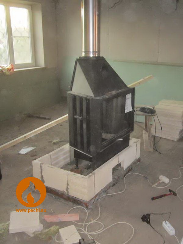 Подготавливаем основание из кирпича, устанавливаем на него каминный вкладыш, подключаем к дымоходу и можно приступать к сборке оболочки. Нужно заранее напилить из шамотных плит детали нужного размера, приготовить по инструкции клей и можно приступать к монтажу. Как происходит монтаж смотрите на примере нашей работы.