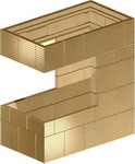 Главным материалом являются шамотные панели. Это панели и элементы крупного формата, но имеющие толщину всего 30-40 мм. Если построить такой камин из традиционного кирпича, то вся конструкция будет нагреваться больше 5 часов. Теперь представьте сколько дров нужно будет сжечь. Тонкая оболочка из шамота прогревается за 1,5-2 часа до температуры 70-75 градусов, а это как раз то, что требуется для комфортного отопления. Эти панели родом из Германии или Чехии. Производители предлагают достаточно большой выбор различных элементов для строительства каминов различных форм. Угловые элементы, радиусные детали, элементы с внутренними ребрами для создания несущих рядов над топочной дверцей. Имея такой набор конструктор может спроектировать практически любой камин. Для строительства аналогичного камина как на рисунке потребуется всего 4 вида элементов: прямые панели, углы 90 градусов, а также маленькая шамотная вставка, которая вклеивается между задних ребер панелей, составляющих ряд над топкой. Накрывается каминная оболочка теплоизоляционной плитой Супер Изол. Делается это для того, чтобы тепло не излучалось от крышки камина, ведь оно все равно пойдет к потолку и пользы от этого не будет никакой. Задача строителей камина добиться прогрева его боковых поверхностей по всей высоте. Для этого внутри оболочки выполняется еще один контур и через отверстия горячий воздух начинает естественную циркуляцию, раздавая тепло по всей поверхности - от верха до низа.